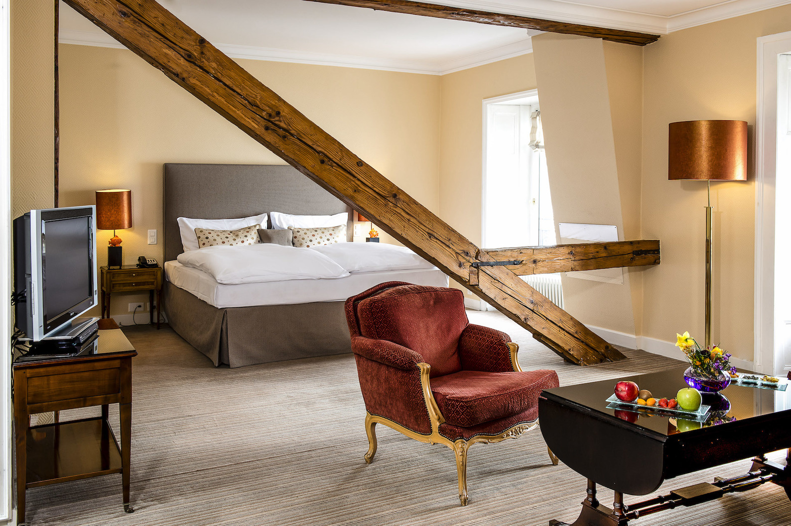 La chambre Supérieure Lac offre une vue imprenable sur le lac Léman et les Alpes, située au dernier étage de notre établissement, elle sont spacieuse et atypique.